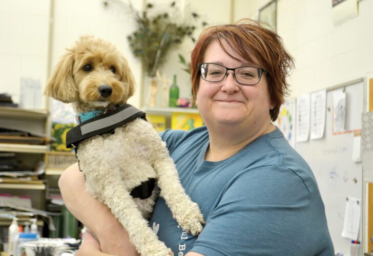 Blue Earth Area teacher Sara Albright poses with Frankie, a Golden Doodle who is a certified therapy dog. Frankie is two years old and spends time in the high school, middle school and elementary school buildings.