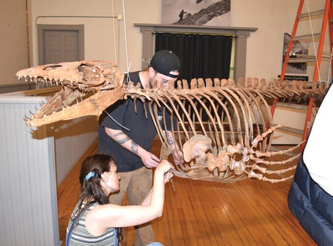 The new Mosasaurus dinosaur fossil arrived in several pieces and had to be assembled before it was raised up by cables in the ceiling. Its toothy smile will greet visitors to the museum in downtown Blue Earth.