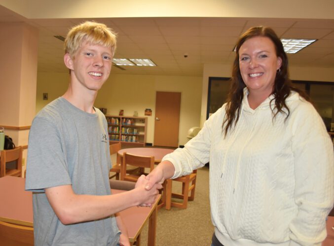 Blue Earth Area High School junior Elijah Goshorn is the newest student member of the BEA School Board. He is welcomed by School Board chair Sara Hauskins, above.