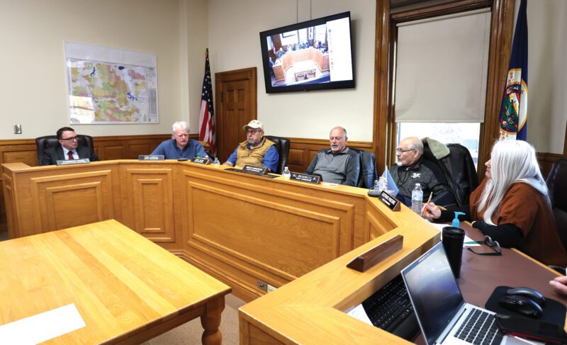 Members of the Faribault County Board of Commissioners discuss the issue of shotguns and rifles for deer hunting, above, during a special County Board meeting last week. Left to right are county attorney Cameron Davis, commissioners Tom Loveall, Greg Young, Bruce Anderson, Bill Groskreutz and Gertrude Paschke.