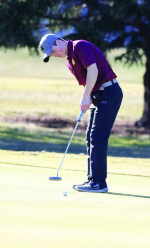 Hunter Spencer putts on the third green at the Minn-Iowa Golf Course in the opening meet of the season.