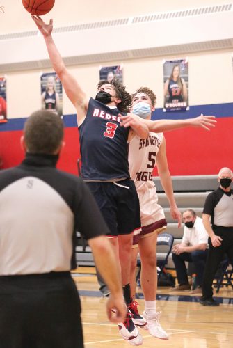 United South Central’s Colten Quade (3) attempts to lay the ball in the hoop against the Springfield Tigers in their playoff game on March 16, in Wells.