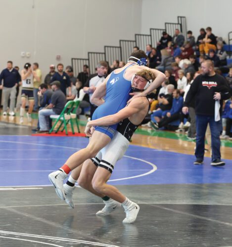 Kolt Bullerman of the Maple River/United South Central Longhorns lifts Owatonna’s Williiam Frantesi before taking him to the mat. Bullerman pinned Frantesi in the first round at the Takedown on 22.